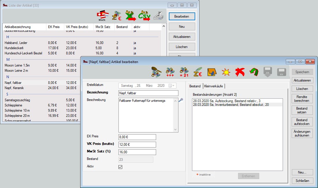 Hier verwalten sie Waren, die sie ihren Kunden verkaufen. Jeder Artikel hat neben Bezeichnung und Beschreibung einen (Brutto) Preis und einen eigenen Mehrwertsteuersatz.