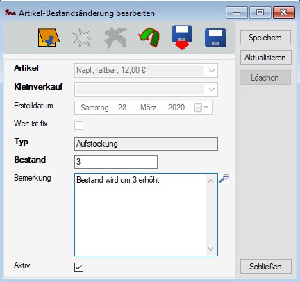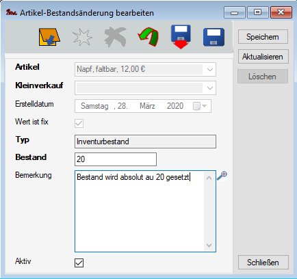 Wird nun bei einer Inventur ein tatsächlicher Bestand festgestellt, der vom dokumentierten Bestand abweicht, kann der Bestand korrigiert werden. Stellt man zum Beispiel bei Inventur fest, dass nur 17 statt 19 Artikel da sind, setzt man den Bestand auf 17 (Bestand setzen).