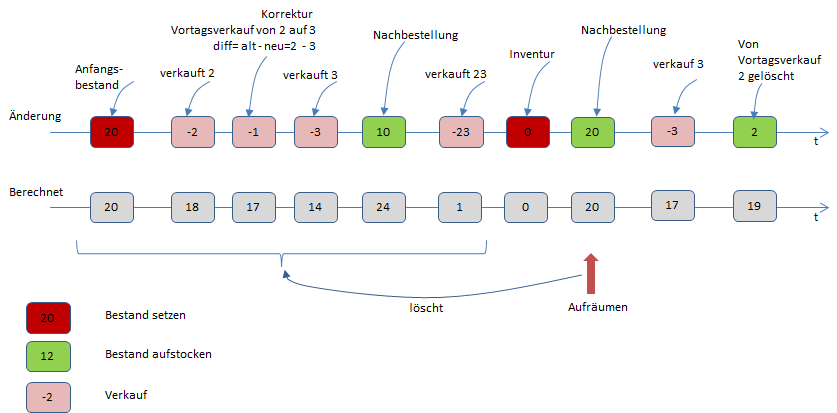 Die obere Zeile beschreibt die Bestand ändernden Aktionen im Laufe der Zeit, die untere Zeile den berechneten aktuellen Stand.