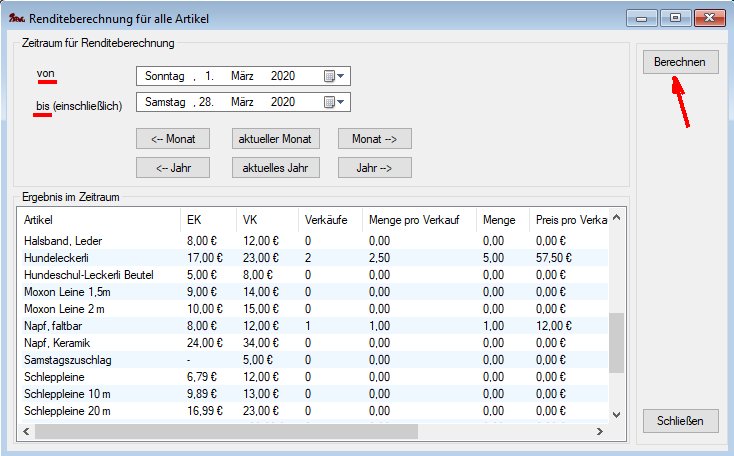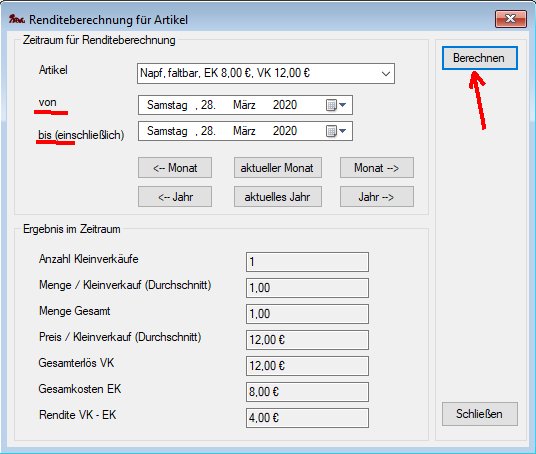 Artikel Rendite. Bei Klick öffnet sich die Rendite-Maske zur Eingabe einer Periode, für die Rendite für den ausgewählten Artikel berechnet werden soll.