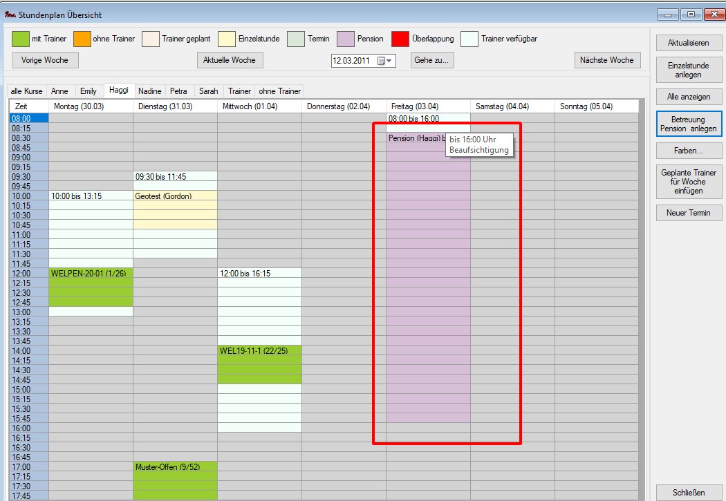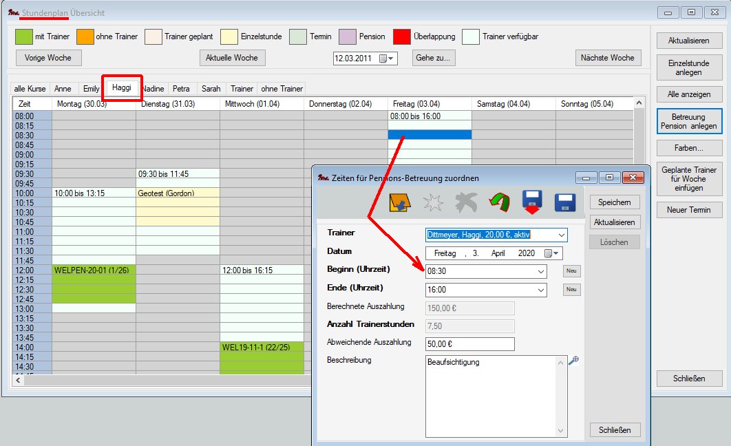Mit Klick auf den Betreuung Pension anlegen Button im Reiter des betreffenden Trainers im Stundenplan kann man Arbeitsstunden in der Pension erfassen. Dazu selektiert man per Mausklick ein Feld mit der passenden Start-Uhrzeit am Einsatz-Tag und klickt den Betreuung Pension anlegen Button. In der Bearbeitungsmaske für die Pension Betreuung kann man dann die Angaben präzisieren. Die Auszahlung wird aus den Angaben für Bezahlung beim Trainer berechnet. Im Feld abweichende Auszahlung kann man bei Bedarf einen abweichenden Betrag festlegen. Dieser Wert ist für die Trainer-Auswertung maßgeblich.
