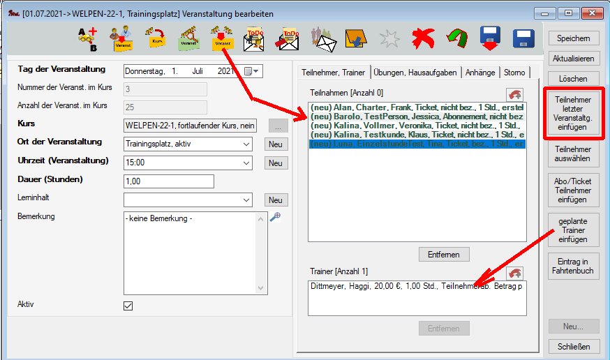 An Veranstaltungen fortlaufender Kurse kann jeder Kunde mit einem gültigen Ticket teilnehmen. Zur Vereinfachung der Teilnehmererfassung kann man über Klick auf den Teilnehmer letzter Veranstaltung einfügen Button die Teilnehmer der letzten Stunde erfassen. Man muss dann nur noch zusätzliche Teilnehmer manuell einfügen oder nicht anwesende löschen.