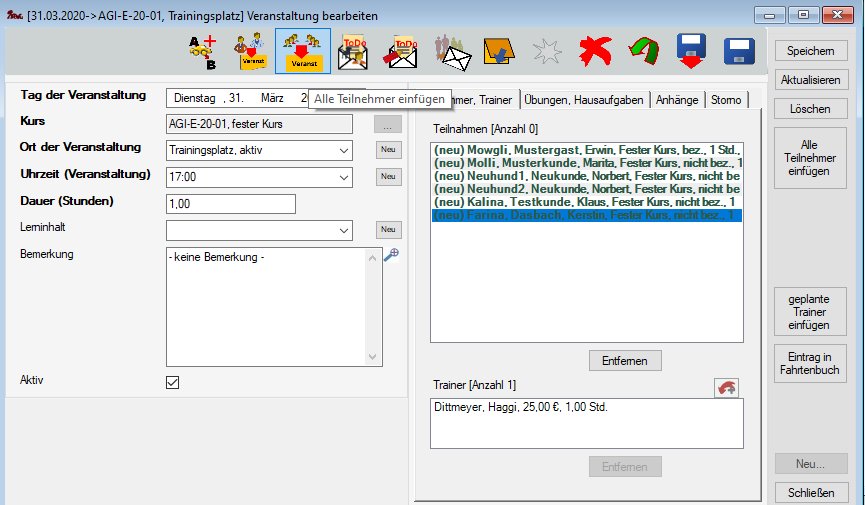 Die Funktion Alle Teilnehmer einfügen fügt alle Kunden mit gültigem Kurs-Guthaben ein, ohne die Veranstaltung zu speichern. Hat ein Kunde mehrere Hunde, wird der Kunde auch mehrfach eingefügt und es erfolgt ein Hinweis: