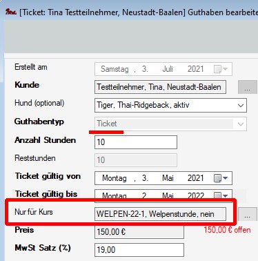 Tickets oder Abos können auf Kurse eingeschränkt werden, indem beim Guthaben das Feld nur für Kurs gefüllt wird.