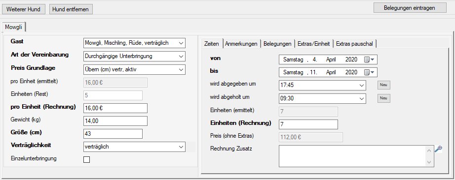 Anmerkung: Ein und derselbe Hund darf mehrfach innerhalb einer Betreuungsvereinbarung eingetragen werden, um zum Beispiel Tagesbetreuungen und Übernachtungen in einer einzigen Betreuungsvereinbarung abzubilden.