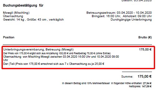 berechnet. Bei Übernachtungen muss der Hol-Tag nach dem Bring-Tag liegen. Bei den übrigen Betreuungsformen können Bring- und Hol-Tag übereinstimmen. Bring- und Hol-Zeiten, Räumlichkeiten, Extras und so weiter werden für jeden Hund gesondert erfasst.