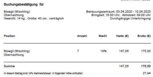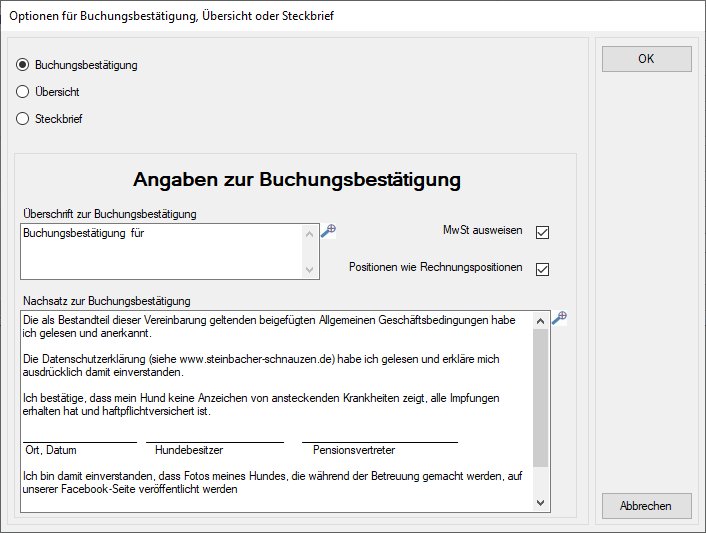 Als Kopf einer Buchungsbestätigung wird der Rechnungskopf verwendet. Wurde ein zweiter Rechnungszyklus für die Pension aktiviert (Menü Hundepension->Rechnungsparameter für Pension), wird der Rechnungskopf der Hundepension verwendet.