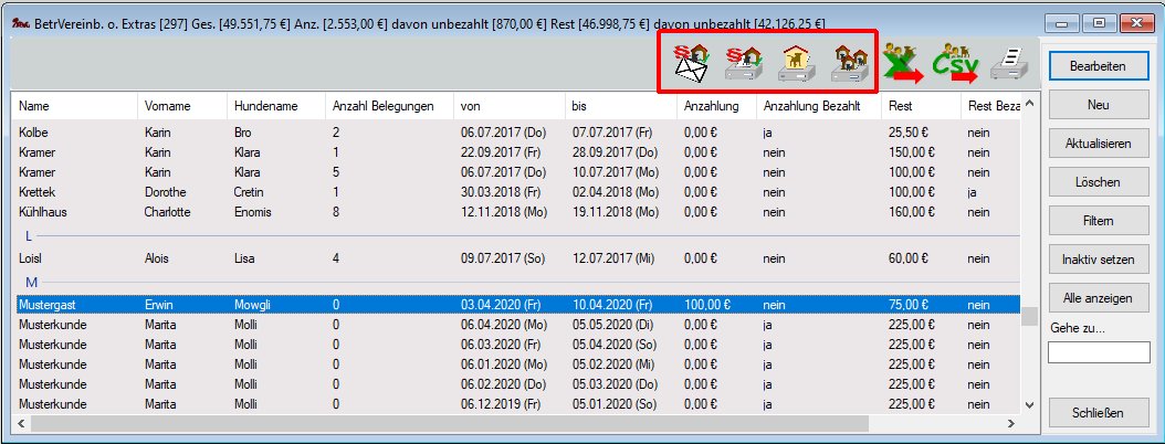 Die nicht rot eingerahmten Icons in der Toolbar gelten für alle Kunden. Die rot eingerahmten Icons erscheinen nur, wenn eine Betreuungsvereinbarung in der Liste selektiert wurde.