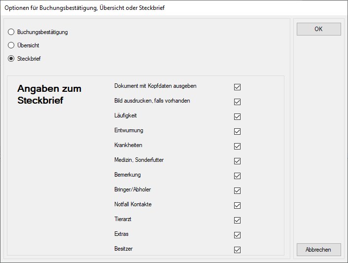 Der Steckbrief ist eine Zusammenfassung der Daten zu einem Pensionsgast, die man beispielsweise zur Info am Raum aufhängen kann, in dem der Gast untergebracht ist. Optional kann man Details für den Steckbrief ein- oder ausschließen.