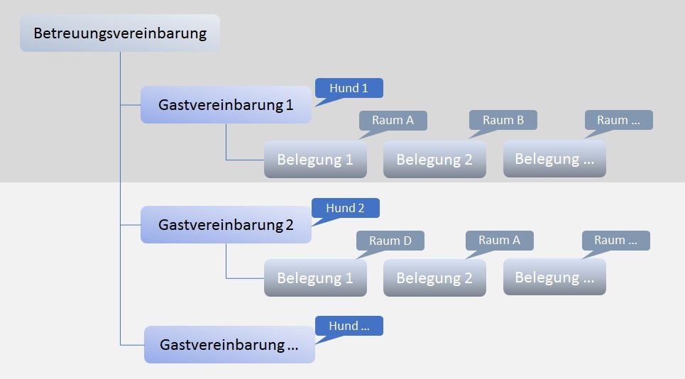 Eine Betreuungsvereinbarung kann für eine oder mehrere Gastvereinbarungen (Hunde) gelten. Zu jedem Hund gehören Belegungen, die dokumentieren, wann und in welchem Raum er untergebracht war oder wird.