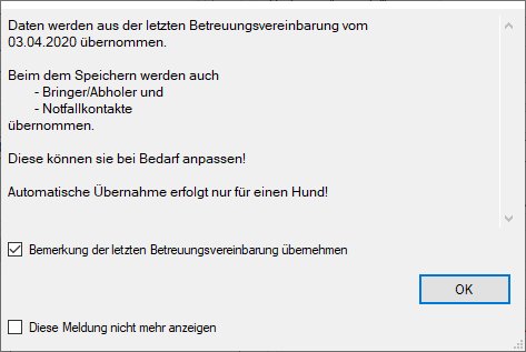 Man kann diese Meldung deaktivieren. Die Bemerkung der letzten Betreuungsvereinbarung wird übernommen, wenn der Haken im Feld Bemerkung der letzten Betreuungsvereinbarung übernehmen gesetzt ist. Die Bemerkung zu übernehmen kann nützlich sein, wenn dort wichtige Informationen zum Betreuungsgast erfasst wurden, die auch für eine spätere BV Gültigkeit haben.