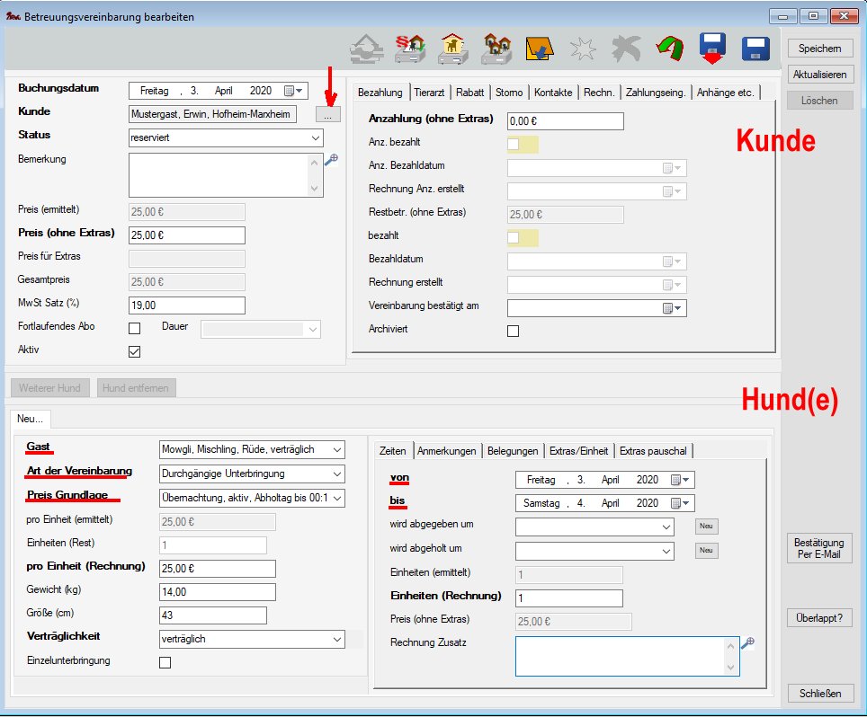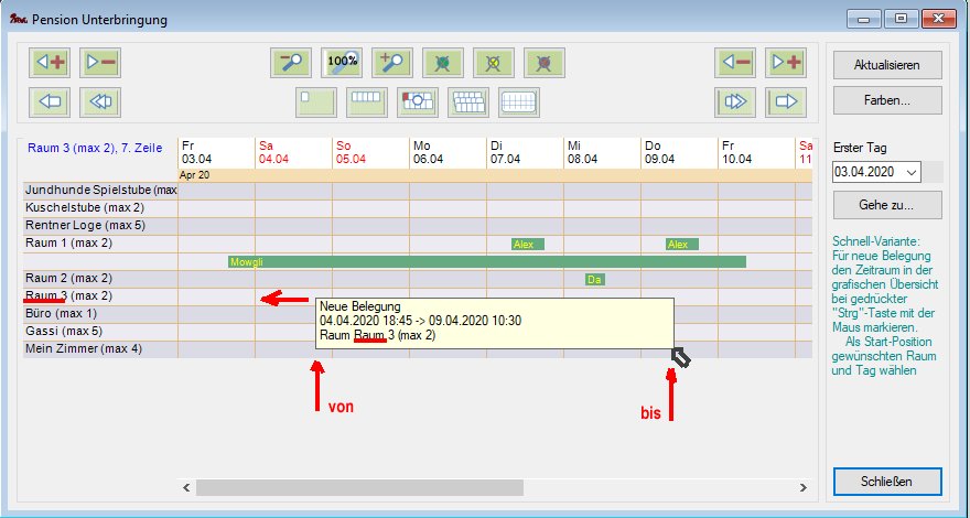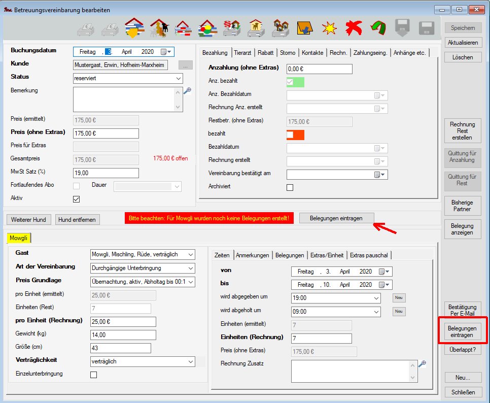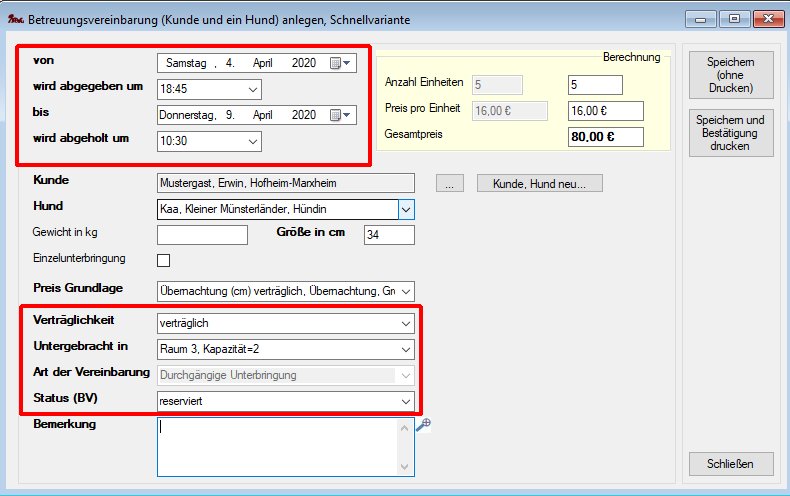 in der Hauptmaske und Auswahl von Betreuungsvereinbarung neu anlegen öffnet eine Maske zum Neuanlegen einer Betreuungsvereinbarung mit der Standardvariante - Schnellvariante: Im Belegungsplan (Menü Hundepension->Belegungsplan (grafische Übersicht)) mit gedrückter Strg-Taste den gewünschten Zeitraum markieren öffnet eine Bearbeitungsmaske für die Schnellvariante zum Anlegen einer Betreuungsvereinbarung