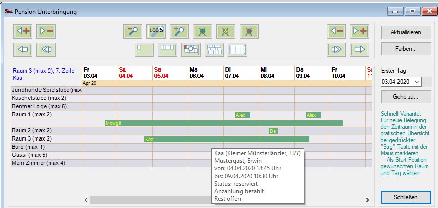 Jeder farbige Balken im obigen Diagramm repräsentiert die Belegung eines Raumes durch einen Hund. Bei Klick mit der rechten Maustaste auf einen dieser Balken wird ein Menü angezeigt, über das man zu den zugehörigen Elementen
