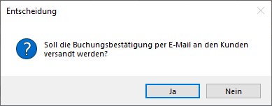 Wählt man Speichern und Bestätigung drucken, öffnet sich die Maske für den Ausdruck der Buchungsbestätigung und man kann die Bestätigung danach unmittelbar per E-Mail versenden: