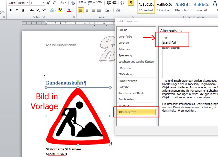 - Dort bei Titel entweder $HBildPfad für Hunde-Bild oder $KBildPfad für Bilder des Kunden eintragen.