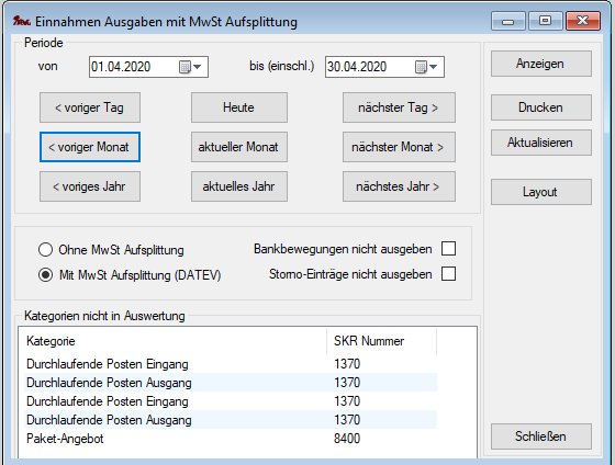 - Menü Kassenbuch->Eingänge/Ausgänge (EÜR, DATEV Export)