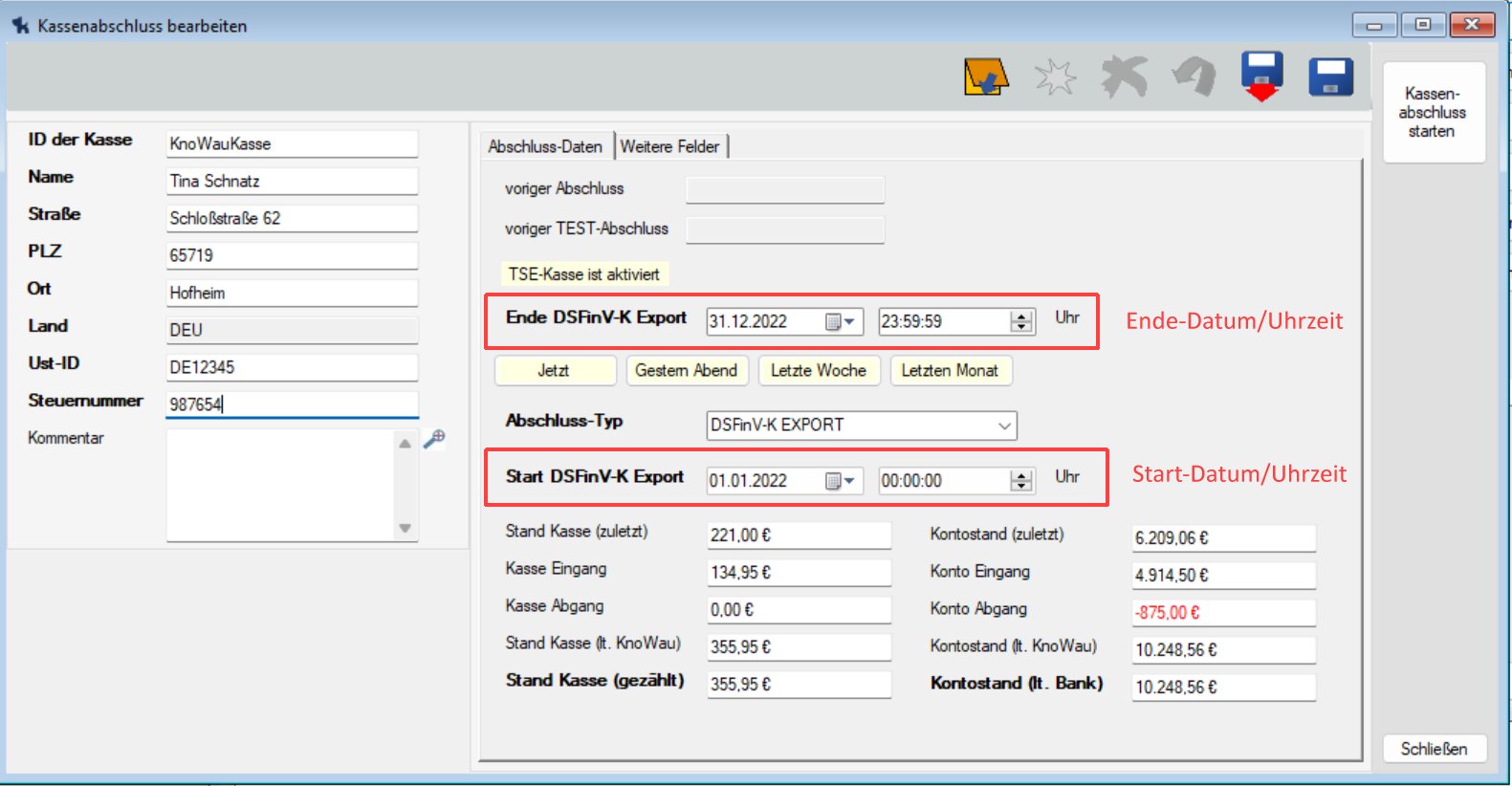 In der Maske den Abschluss-Typ "DSFinV-K EXPORT" wählen und die gewünschten Start-/Ende Datum und Uhrzeit angeben. Dann "Kassenabschluss starten".