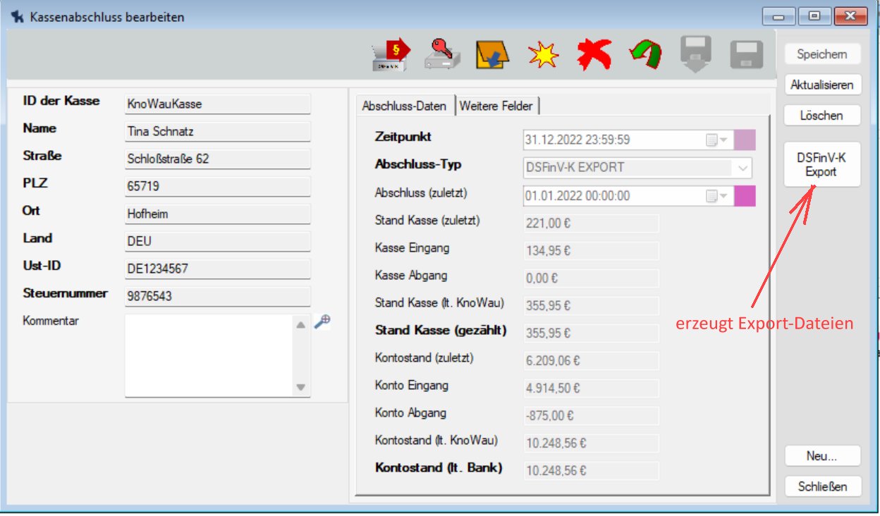 Bei Steuerprüfungen verlangt das (deutsche) Finanzamt die Bereitstellung abrechnungsrelevanter Daten in einem vorgegebenen Fomat (DSFinV-K Bereitstellung). Diese DSFinV-K Datei kann mit KnoWau erstellt in zwei Schritten erstellt werden: