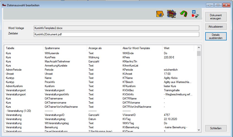 Aus dem Dialog Word Vorlagen ausprobieren erreicht man den Dialog zur Bearbeitung der Datenauswahl für das Zieldokument.