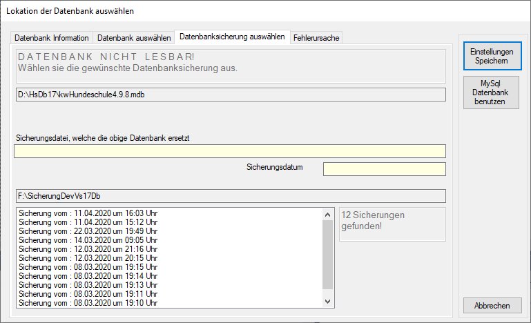 Anmerkung: Die ersetzte "nicht lesbare" Datenbank bleibt erhalten, nur ihr Name ändert sich, er erhält einen Suffix der Form .Rdd.MM.yyyy_hh_mm_ss, wobei dd=Tag, MM=Monat, yyyy=Jahr, hh=Stunde, mm=Minute, ss=Sekunde bedeutet.