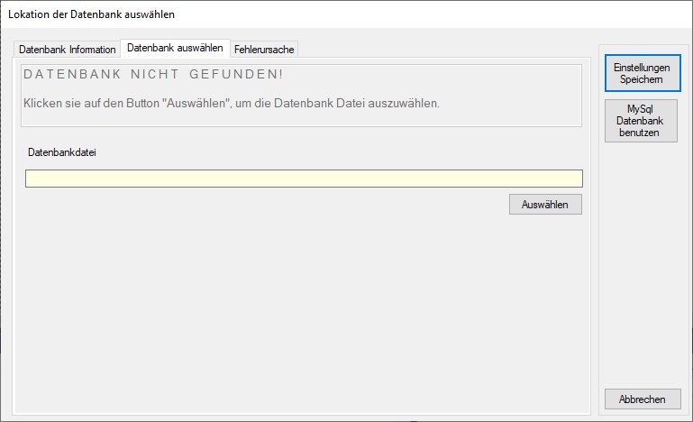 Sollte KnoWau beim Start die Datenbank nicht finden, kann man die Datenbank an einer anderen Stelle im Dateisystem ihres Computers zu suchen. Wenn die Datenbank nicht gefunden wird, erscheint die folgende Maske:
