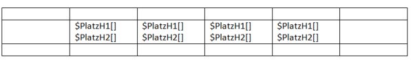 Um Daten, die mehrfach im Dokument vorkommen, auf eine Zeile zu verteilen, müssen die zugehörigen Platzhalter um den Spaltenindikator [ ] erweitert werden. Man hängt eine eckige Klammer auf und eine eckige Klammer zu ohne Leerzeichen direkt an den Platzhaltern an und verwendet denselben Ausdruck in jeder Zeilenzelle, in der ein Wert erscheinen soll.