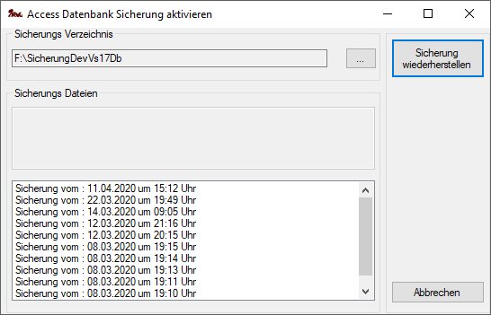 Im unteren Teil der Maske ist die Liste aller Sicherungsdateien, die für eine Wiederherstellung zur Verfügung stehen, die jüngste Sicherung steht ganz oben in der Liste.
