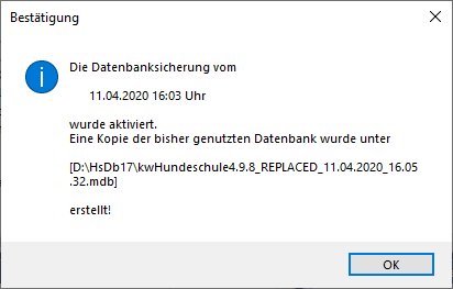 Vor dem nächsten Programmstart hat man die Möglichkeit, doch noch mit der bisherigen Datenbank weiter zu arbeiten. In jedem Fall wird von jeder ersetzten Datenbank eine Sicherung erstellt.