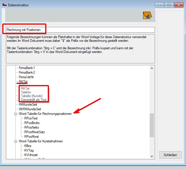 Jede dieser Datenstrukturen definiert Platzhalter, die in einer Word Vorlage verwendet werden können. Die folgende Skizze zeigt einen Ausschnitt der Datenstruktur für Rechnung.