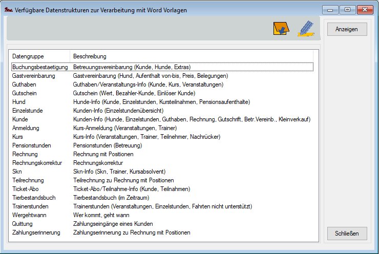 Platzhalter für mehrfach pro Dokument vorkommende Daten sind jeweils unter einer eigenen Überschrift Word-Tabelle... gelistet.