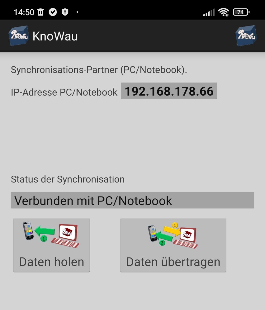Daten holen: Daten werden vom PC geholt und lokale Daten der App überschrieben! Falls es lokale Änderungen gibt, erfolgt vor dem Holen der Daten eine Warnung.