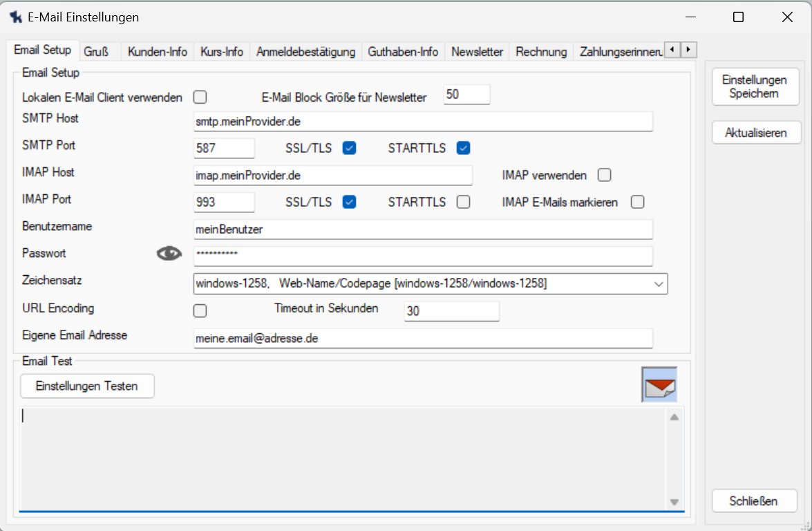 Einstellungen für den E-Mail Versand werden im Dialog E-Mail->Einstellungen und E-Mail Texte vorgenommen. Im Reiter E-Mail Setup tragen sie die Zugangsdaten ihres Providers ein.