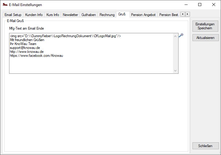 Die Festlegung der Signatur erfolgt im Dialog E-Mail->Einstellungen und E-Mail Texte im Reiter Gruß.