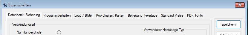 Einstellungen, Software anpassenWeitere Einstellungen Eigenschaften Über das Menü Datei->Eigenschaften öffnet man die Maske für allgemeine Konfigurations-Einstellungen. Die Einstellungen sind auf mehrere Reiter verteilt: Reiter: Datenbank, Sicherung MySql Einstellungen Programmverhalten Logo / Bilder Koordinaten, Karten Betreuung, Feiertage Standard Preise PDF, Fonts