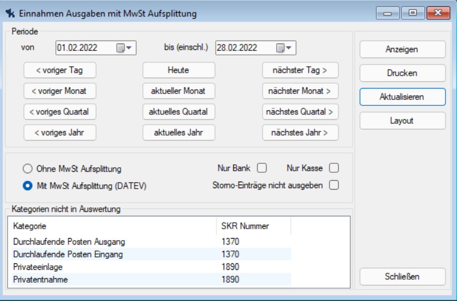 Man erreicht die Funktion über das Menü Kassenbuch->Eingänge/Ausgänge (EÜR, DATEV Export).