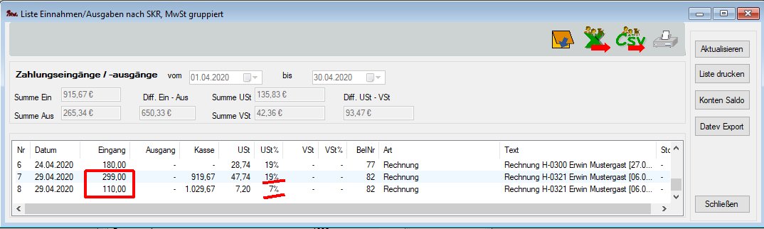 Im folgenden Beispiel gibt es eine Rechnung über 409,- €, für die 54,94 € MwSt berechnet werden. Die Rechnung enthält aber Positionen mit 7% MwSt und solche mit 19% MwSt.
