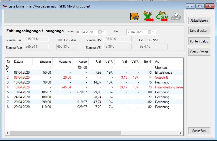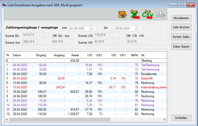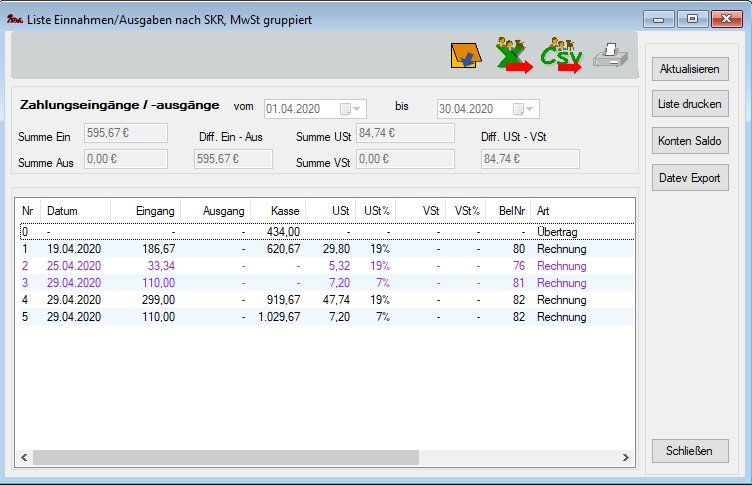 Für die zweiten Liste oben wurde die Option Nur Kasse gewählt. Jetzt sind nur noch bare Zahlungsbewegungen zu sehen.