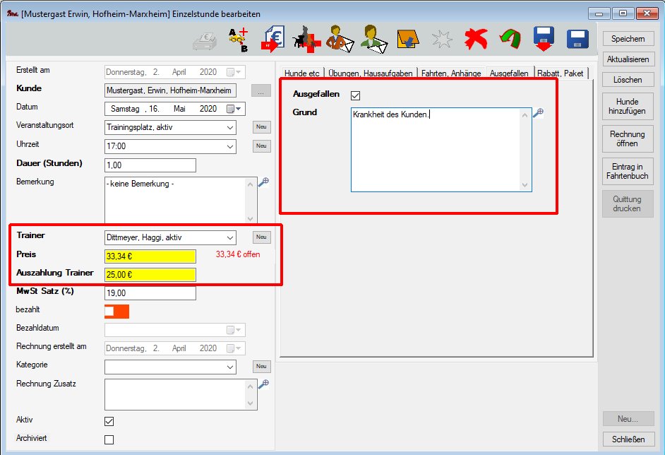 Die Felder Preis und Auszahlung Trainer werden bei ausgefallenen Einzelstunden gelb markiert, wenn ein Preis angegeben wird.