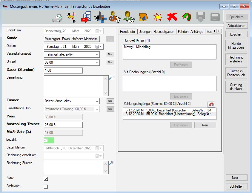 Anmerkung: Neue Einzelstunden können einfach direkt aus einer Kundenmaske angelegt werden, der Kunde ist dann in der Bearbeitungsmaske bereits vorbelegt.