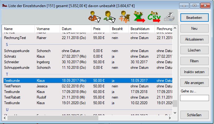 Die Liste der Einzelstunden erreicht man über das Menü Verwaltung->Einzelstunden oder das Icon