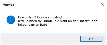 Hunde einfügen: Klick fügt alle aktiven Hunde des Einzelstunden-Kunden ein. Falls mehrere Hunde eingefügt werden, erfolgt eine Mitteilung: