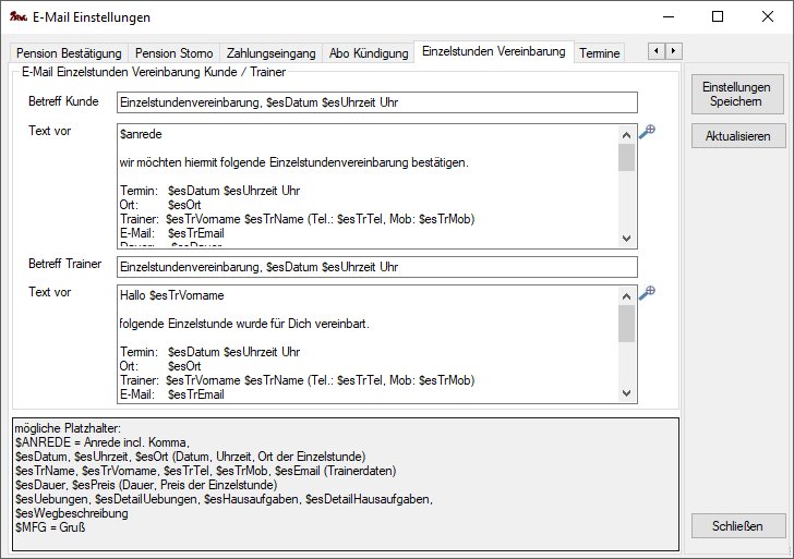 $esDatum, $esUhrzeit, $esOrt Datum, Uhrzeit, Ort der Einzelstunde