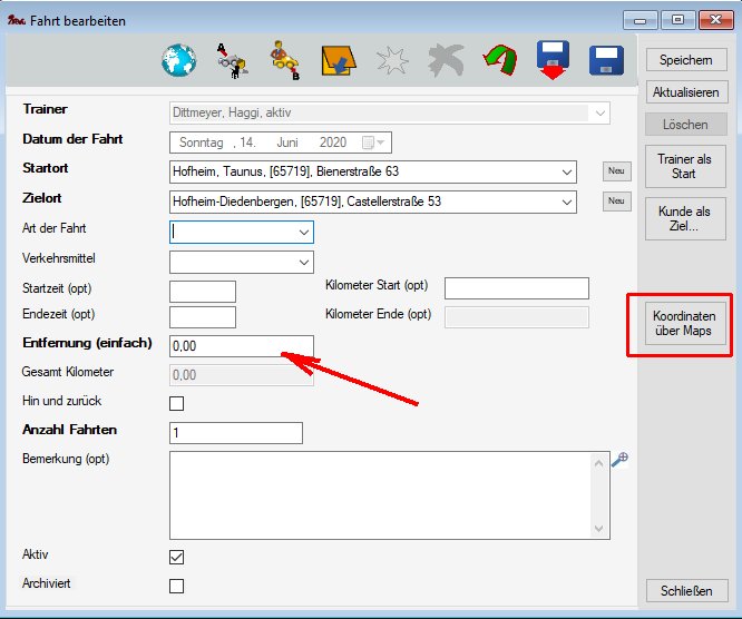 Wenn die Fahrtstrecke zum ersten mal erfasst wird, muss die Entfernung zwischen den Endpunkten noch bestimmt werden. Die Entfernung kann man auch direkt über den Kartendienst per Klick auf den Button Koordinaten über Maps bestimmen.
