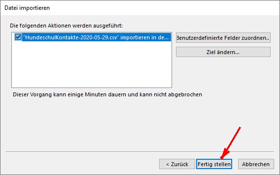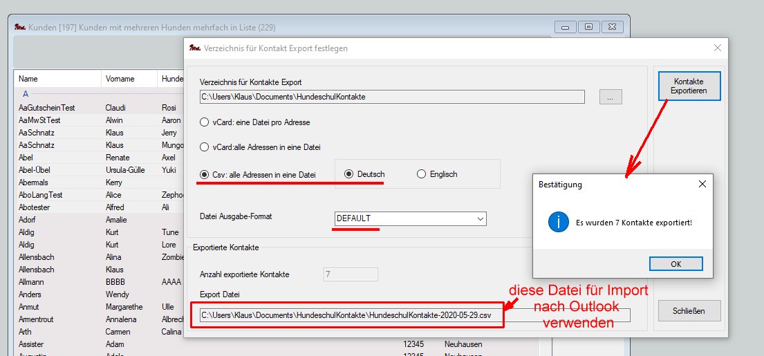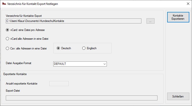 - Csv, alle Adressen in eine Datei: dieses Format wird von vielen Webmail-Portalen mit Adressbüchern akzeptiert. Wenn sie Adressen ihrer Kunden in ihr Webmail Portal exportieren möchten, verwenden sie dieses Format. Ob ihr Portal das Format unterstützt, müssen sie selbst ausprobieren. Die Export-Datei HundeschulKontakteKontakte<ErstellDatum>.csv befindet sich dann in dem unter Verzeichnis für Kontakt Export festgelegten Verzeichnis.