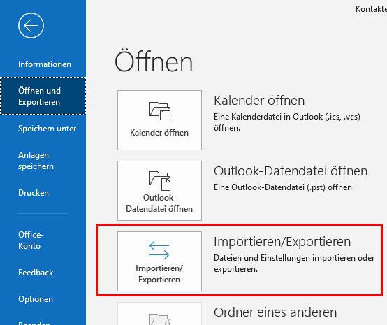 Nach Klick auf den Kontakte Exportieren Button kann die Export-Datei für den Import nach Outlook verwendet werden. - Schritt 4: In Outlook Datei->Öffnen und Exportieren, Importieren/Exportieren wählen