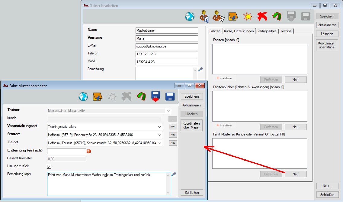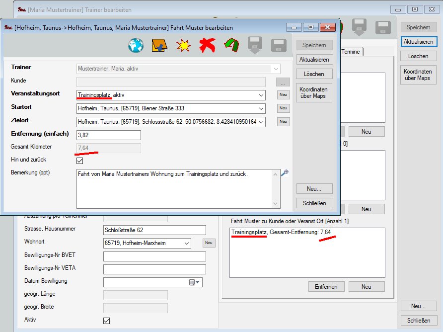 In der Bearbeitungsmaske für den Trainer erscheint der Eintrag in Bereich Fahrt Muster (Vorlage für häufige Fahrten).
