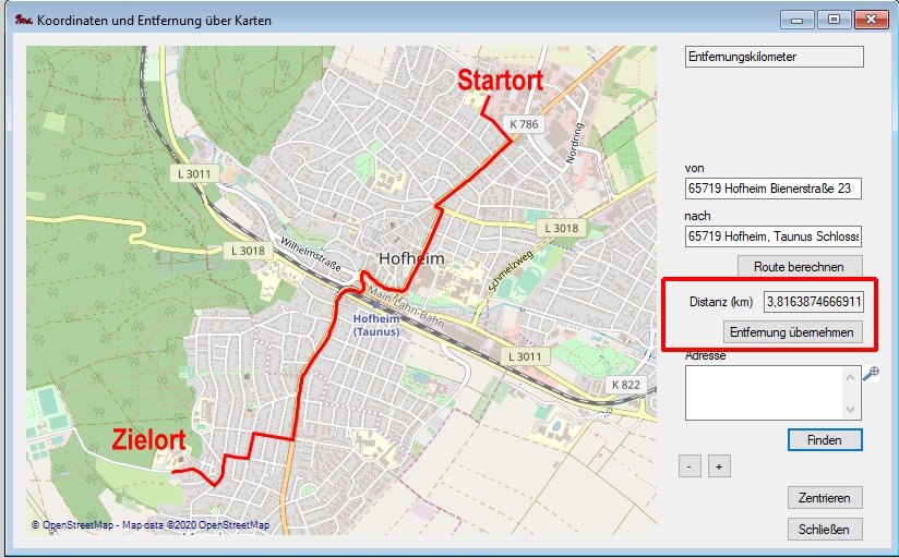 Die Entfernung zwischen Startort und Zielort kann man über den Kartendienst ermitteln. Nach klick auf den Koordinaten über Maps Button öffnet sich die Karte mit der Fahrtstrecke (falls Startort und Zielort gefunden werden).