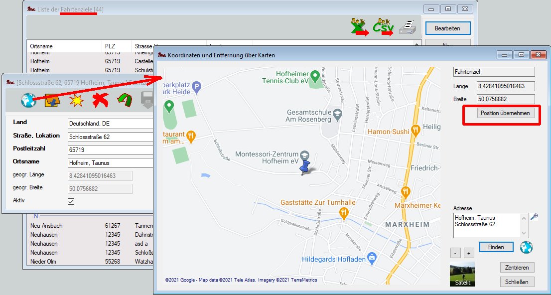 Wurde die Adresse gefunden, können die Koordinaten für das Fahrtenziel mit dem Position übernehmen Button übernommen werden.