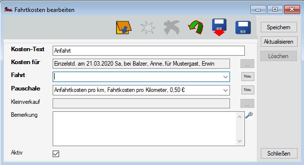 Fahrtkosten können für Einzelstunden berechnet werden. Wurde im Zusammenhang mit einer Einzelstunde eine Fahrt unternommen, die dem Kunden in Rechnung gestellt werden soll, kann sie als Fahrtkosten der Einzelstunde zugeordnet werden. Für die Fahrtkosten wird neben der Fahrt eine Kilometer Pauschale benötigt.