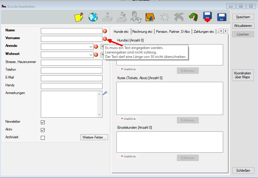 Führt man die Maus über einen dieser roten Kreise, erhält man detaillierte Information über den Fehler. Im Beispiel wurde der Mauszeiger über dem roten Kreis beim Vornamen des Kunden geführt. Die Meldung sagt aus, wie das Feld gefüllt werden muss, damit eine Speicherung erfolgen kann.